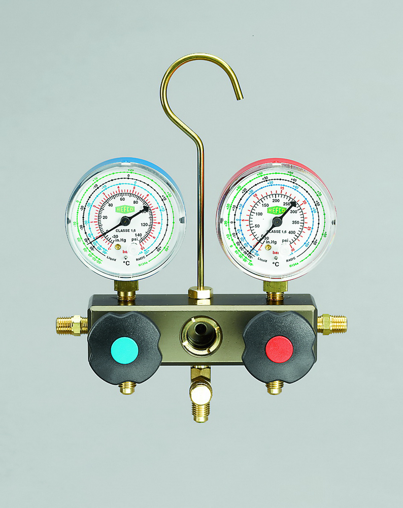 Манометрические коллектора, укомплектованны манометрами с трубкой Бурдона. Есть крюк, без аксессуаров. Поставляются в блистере. Для хладагентов R134a, R407C, R22.