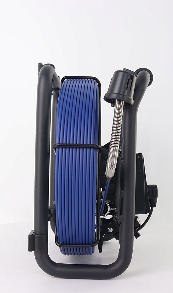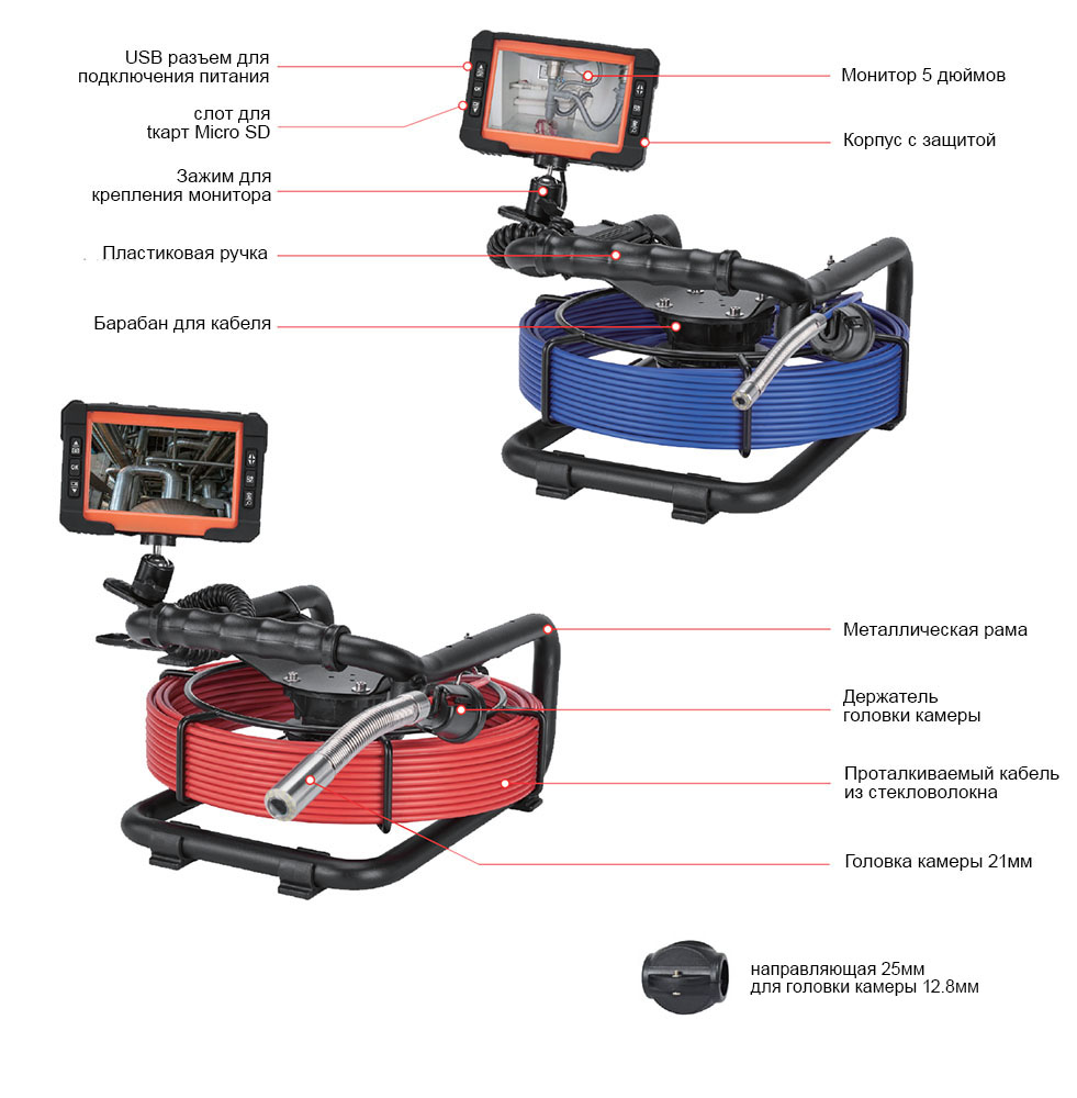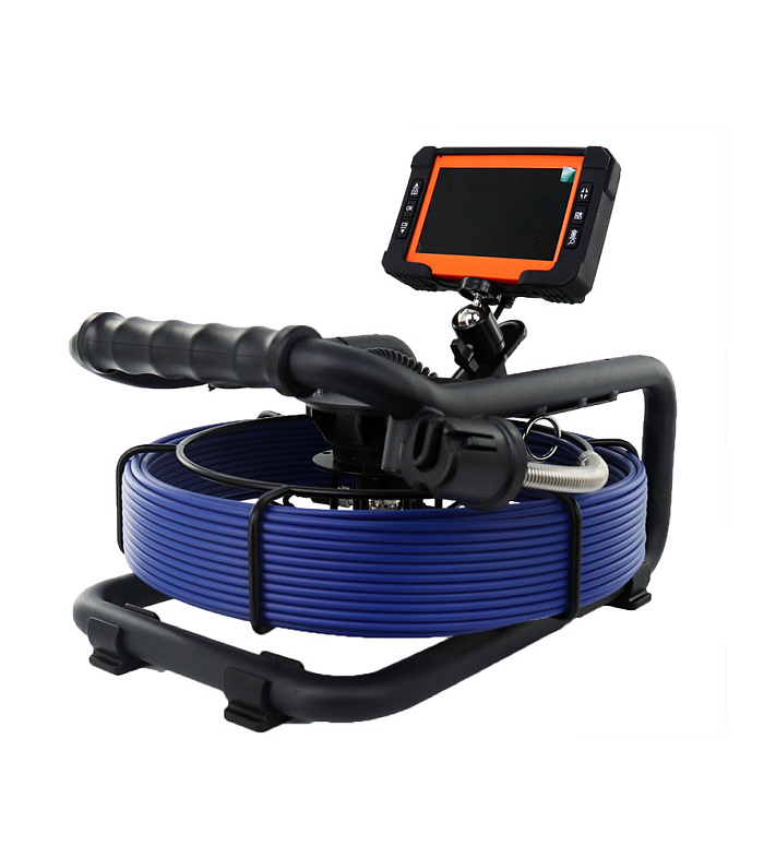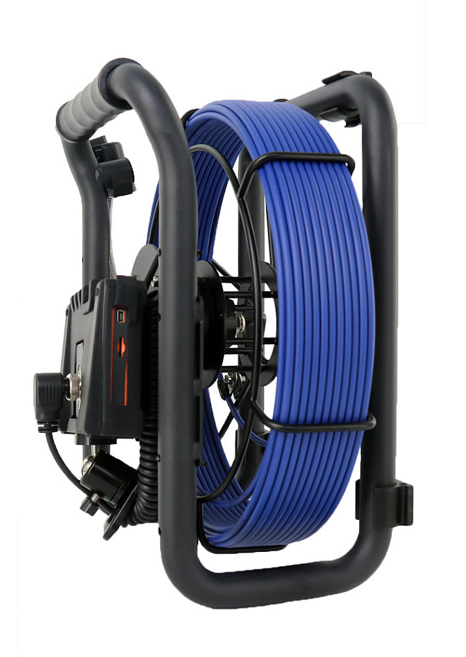 Проталкиваемая ТВ камера серии MINI для осмотра труб. Длина кабеля 30м, диаметр 4.8 мм, поворотный на 360 градусов дисплей 5», головка камеры 12.8х21мм с разрешением 640х480. Вес 5 кг.