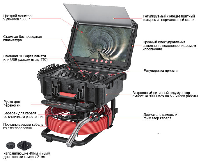 Благодаря встроенной подсветке и влагозащите, телеинспекция обеспечивает стабильную работу даже в затопленных или загрязнённых участках. Система оборудована монитором и функцией записи, что позволяет сохранить видеоматериалы для анализа и отчетности.