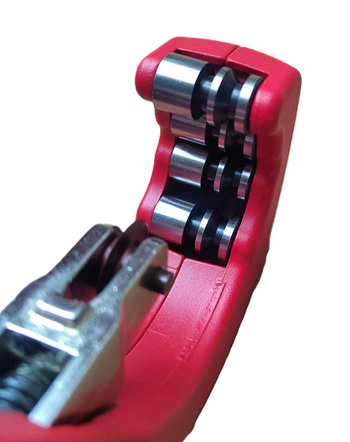 Ручной труборез Zenten серии KOMPAKT PLUS QUICK предназначен для ручного разрезания тонкостенных медных, алюминиевых и стальных труб Ø от 6 до 54 мм и толщиной стенки до 2 мм. Система быстрого перемещения QUICK позволяет молниеносно подстроить труборез под нужный диаметр. Благодаря конструкции, роликовые труборезы обеспечивают строго перпендикулярный рез относительно оси трубы.