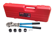Комплект для ручного прессования радиальных пресс-фитингов полимерных и металлополимерных труб с контуром обжатия ТН. Универсальный ручной пресс-инструмент для пресс-вкладышей. Телескопические рукоятки. Поворотная пресс-головка на 360 о. Четыре комплекта пресс-вкладышей от 16 до 32 мм.