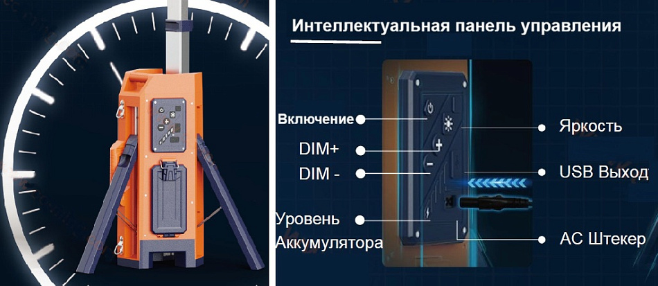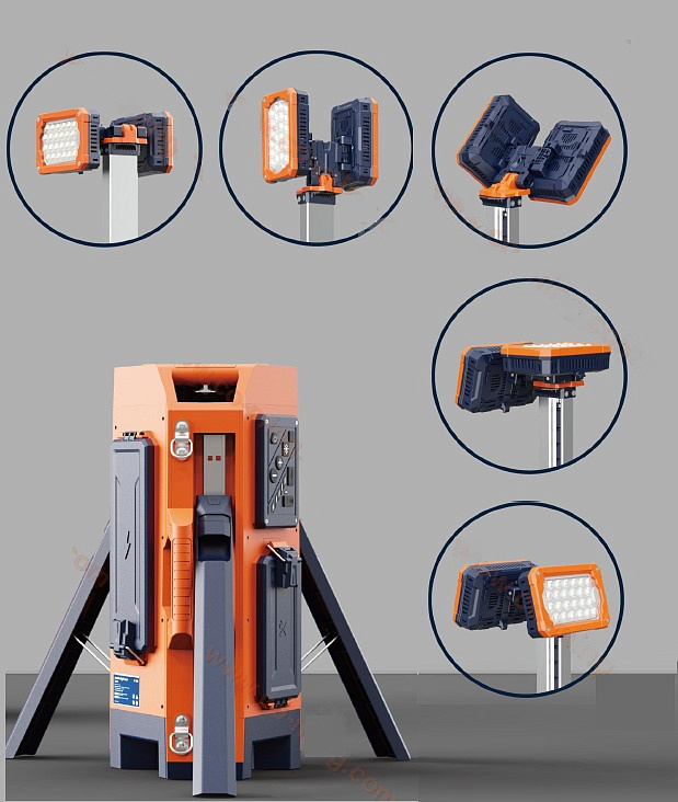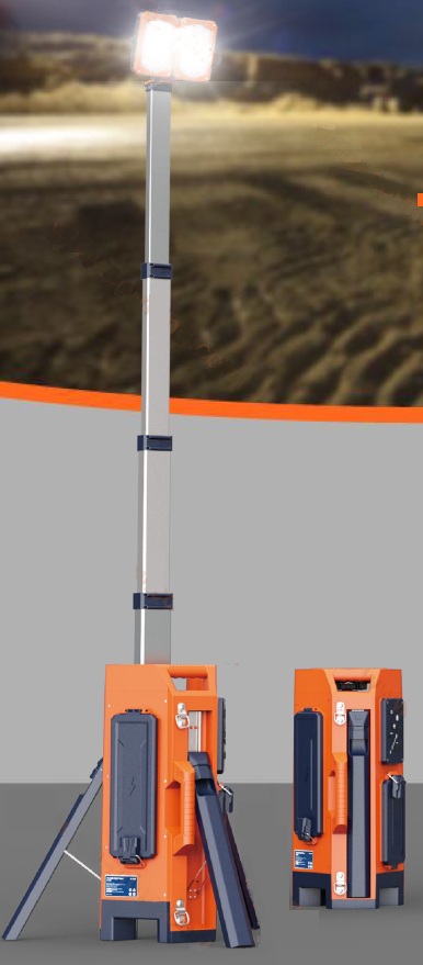 Мощная мобильная световая башня с телескопической конструкцией высотой до 2,2 м. Прожектор из 2-х осветительных головок с поворотом на 3600 и наклоном 1800. Три АКБ Li-Ion 24,5 В, 4 А•ч, 98 Втч. Четыре режима светового потока до 17 000 лм. Время работы от 3-х АКБ в режиме Standard >20 ч. IP65. Вес без АКБ - 10 кг.