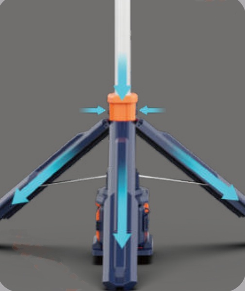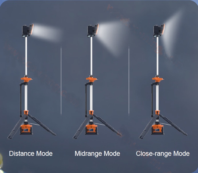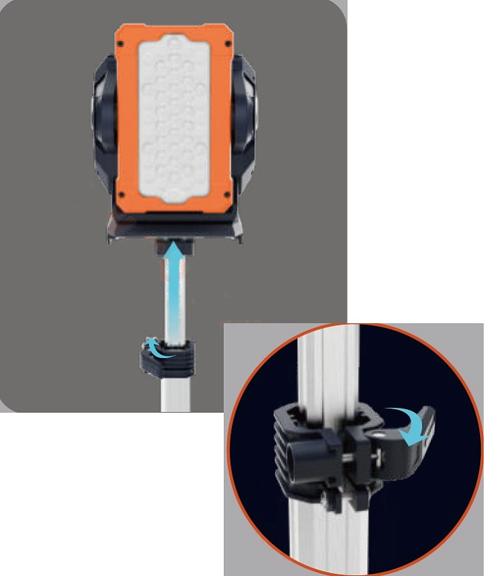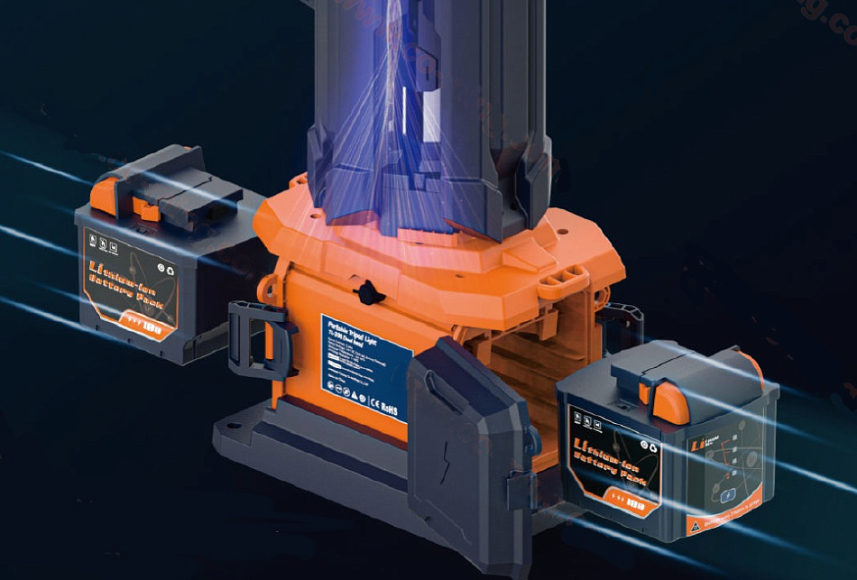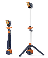 Мощная мобильная световая мачта с телескопической конструкцией высотой до 2,3 м. Привод осветительной головки с дистанционным управлением, поворотом 3600 и наклоном 1800. Три режима светового потока до 12 000 лм. Два АКБ Li-Ion 24,5 В, 4 А•ч, 98 Втч. Время работы от двух аккумуляторов в режиме Standard до 8+ ч. IP66. Вес без АКБ - 9,7 кг.