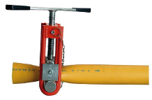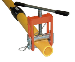 Сжатие ПЭ-трубы происходит благодаря вращению рычага с винтовой передачей.