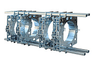 Позиционер имеет четыре основных зажима с функцией удаления овальности. Зажимы могут располагаться на направляющих на любом расстоянии друг от друга. На позиционер дополнительно можно установить цепное устройство для стягивания труб в электросварные муфты. В позиционере можно использовать электросварные муфты любого производителя.