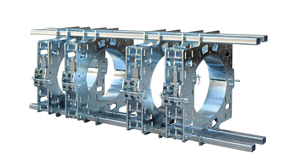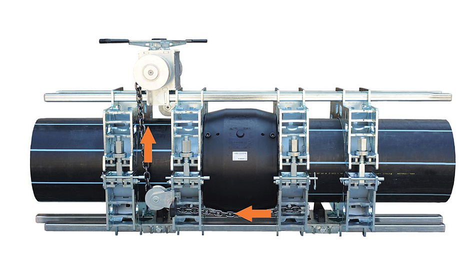 Позиционер имеет четыре основных зажима с функцией удаления овальности. Зажимы могут располагаться на направляющих на любом расстоянии друг от друга. На позиционер дополнительно можно установить цепное устройство для стягивания труб в электросварные муфты. В позиционере можно использовать электросварные муфты любого производителя.